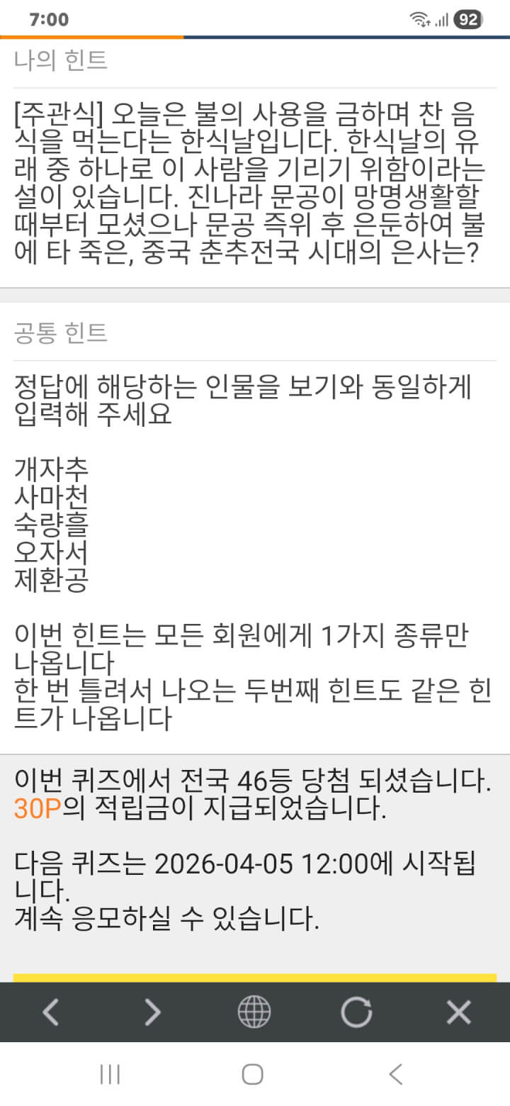아침 퀴즈 이벤트 30원 획득 적립을 하였습니다. 감사합니다.