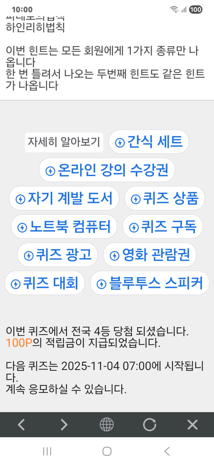밤 퀴즈 이벤트 100p 획득 적립을 하였습니다. 감사합니다.