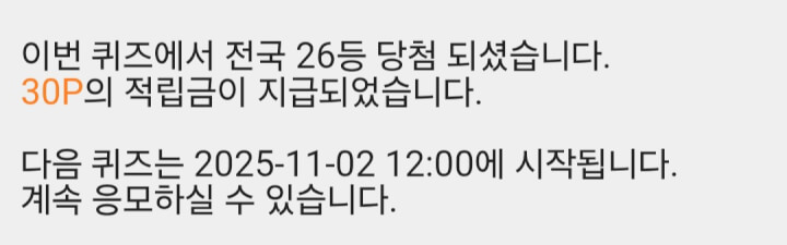 7시 퀴즈에서 30p 받았습니다 😊 댓글로 함께해 주셔서 감사합니다 ❤️🩷🧡