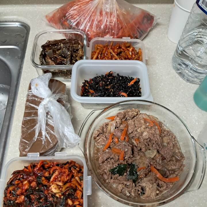 어제 저녁 친정에서 엄마와 언니들이 해온 반찬 조금씩 나누어 가져왔어요. 반찬 부자가 되었네요~~