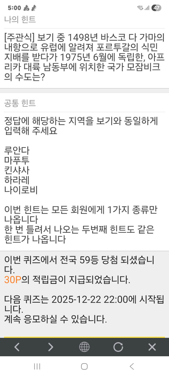 퀴즈 이벤트 30p 획득 적립을 하였습니다. 감사합니다.