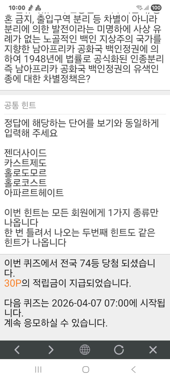 밤 퀴즈 이벤트 30원 획득 적립을 하였습니다. 감사합니다.