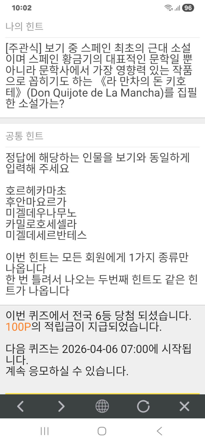밤 퀴즈 이벤트 100p 획득 적립을 하였습니다. 감사합니다.