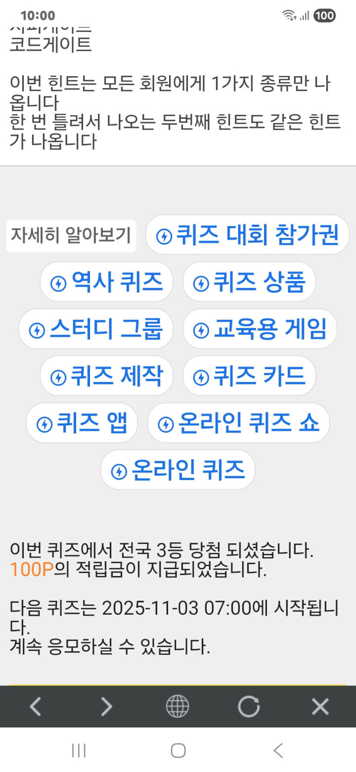 퀴즈 이벤트 100p 획득 적립을 하였습니다. 감사합니다.