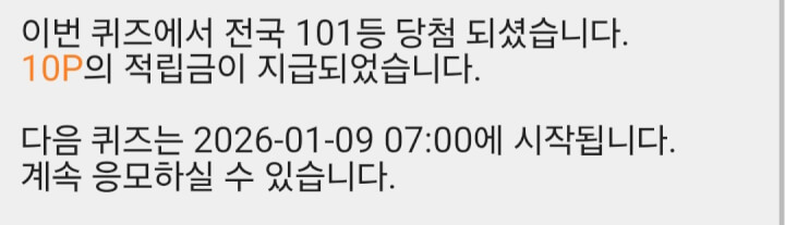 10시 퀴즈에서 101등으로 10p 받았습니다 😊 101101~~대칭숫자 같이 올립니다 😄 댓글로 함께해 주셔서 감사합니다 ❤️🩷🧡🍀