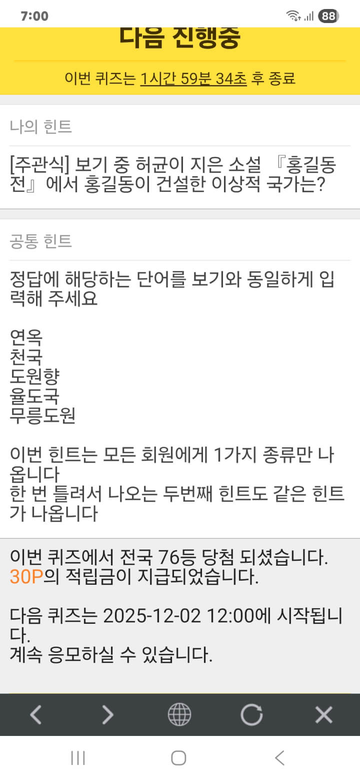 퀴즈 이벤트 30p 획득 적립을 하였습니다.