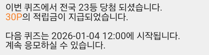 7시 퀴즈에서 30p 받았습니다 😊 댓글로 함께해 주셔서 감사합니다 ❤️🩷🧡🍀