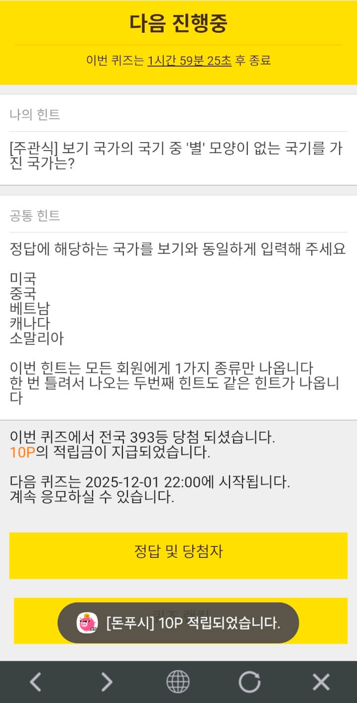 5시퀴즈 10원 받았습니다