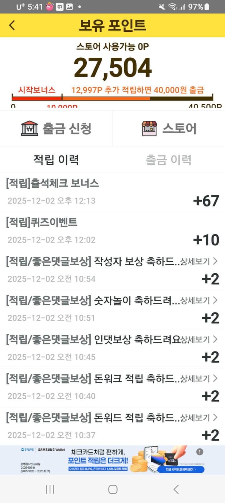 출첵 보너스 67원 받았어요 감사합니다 엄청 춥다고 하네요 옷 따뜻하게 입으시고 건행하세요