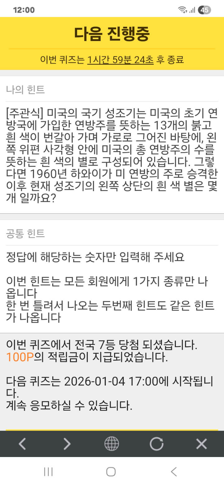 퀴즈 이벤트 7등 100p 획득 적립을 하였습니다. 감사합니다.