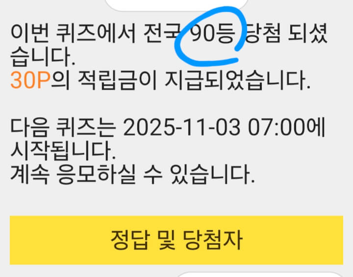 ์ง๋๋ฐค 10์ํด์ฆ 90๋ฑํ๊ณ 30p ๋ฐ์์ต๋๋ค ๊ธฐ๋ถ์ข๊ฒ ์ฌ๋ฆฝ๋๋ค