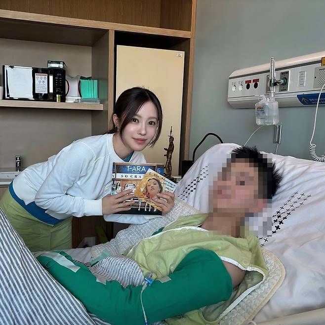 함께 공개된 사진 속엔 팬을 만나러 직접 병원까지 찾아간 효민의 모습이 담겨 있다. 이는 한 사회복지사가 효민에게 보낸 메시지 때문.