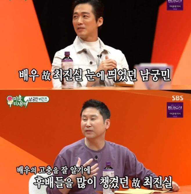 남궁민은 "지금은 돌아가셨다. 故 최진질 씨께서 저는 매니저도 없고 아무것도 없으니까 제가 많이 안쓰러웠나 보다"라며 故 최진실을 언급했다. 신동엽 역시 "본인도 고생을 참 많이 해가지고 그런 모습 보면 안쓰러운 마음 들어서 많이 챙겨줬다"라며 故 최진실을 떠올렸다.