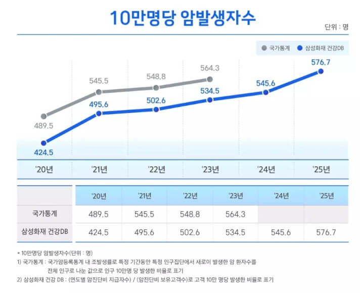 삼성화재에 따르면 전체 인구 10만 명당 암 발생자는 2020년 424.5명에서 2025년 576.7명으로 증가했으며, 작년 신규 암 환자 중 65세 이상 비중은 29.7%로 나타나 상승 추세를 보였다.