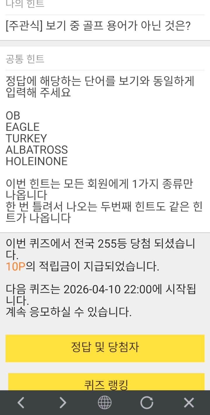 5시 퀴즈10점 받았어요. 10시 퀴즈 화이팅 하세요 ~~
