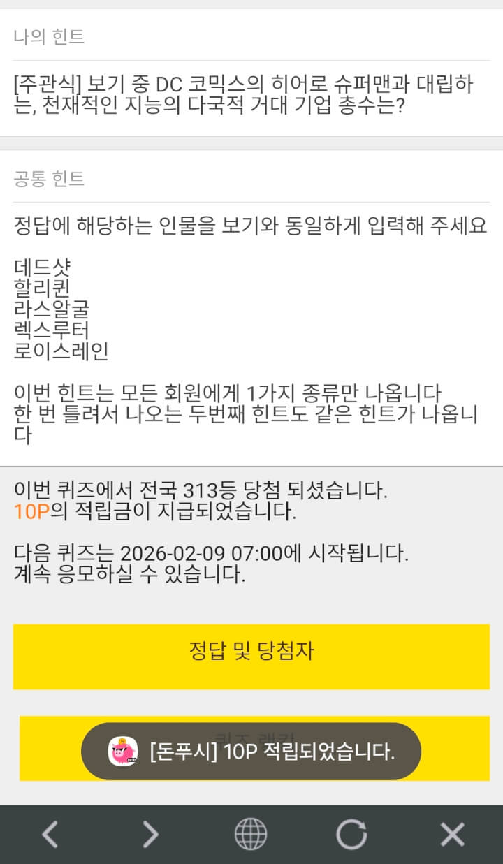10시퀴즈 10원 받았습니다