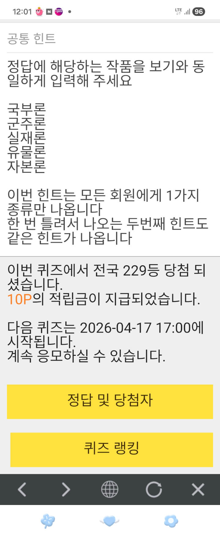 12시퀴즈 10원받고 늦은오후 푸시글 올립니다 ☘️