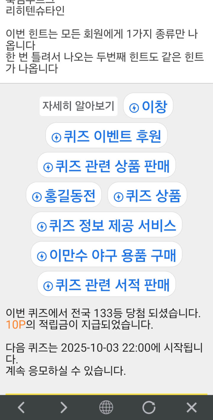 5시 퀴즈10점 받았어요. 10시 퀴즈 화이팅 하세요 ~~