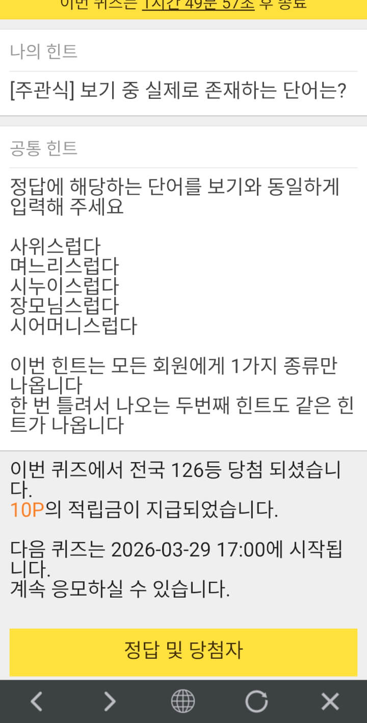 12시 퀴즈10점 받았어요. 5시 퀴즈 화이팅 하세요 ~~