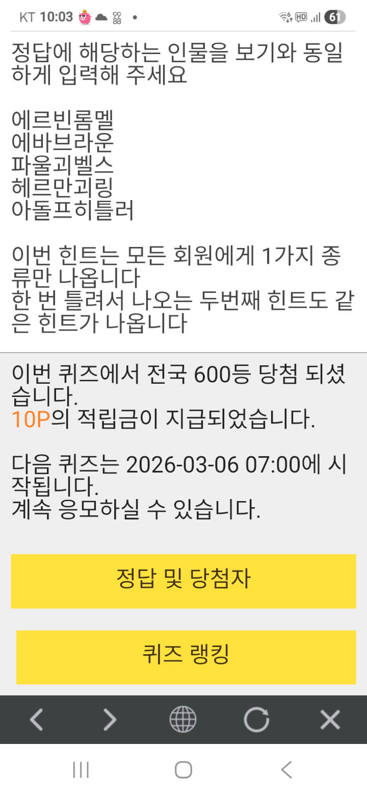 10시퀴즈 10원 받아 올려봅니다 댓글 함께해 주셔서 감사합니다 편안한 저녁시간 보내시고 편안한 밤 보내세요