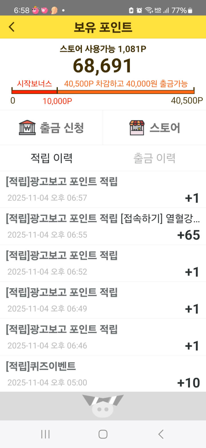 저녁시간 적립 소식 전합니다 돈팝이 더 크네요 안하신분들 하시라고 올려보네요