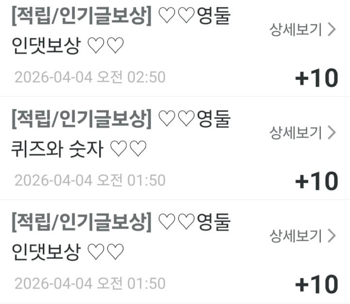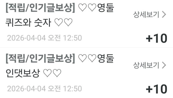 어제받은 인기글보상 5개 감사합니다 ☘️