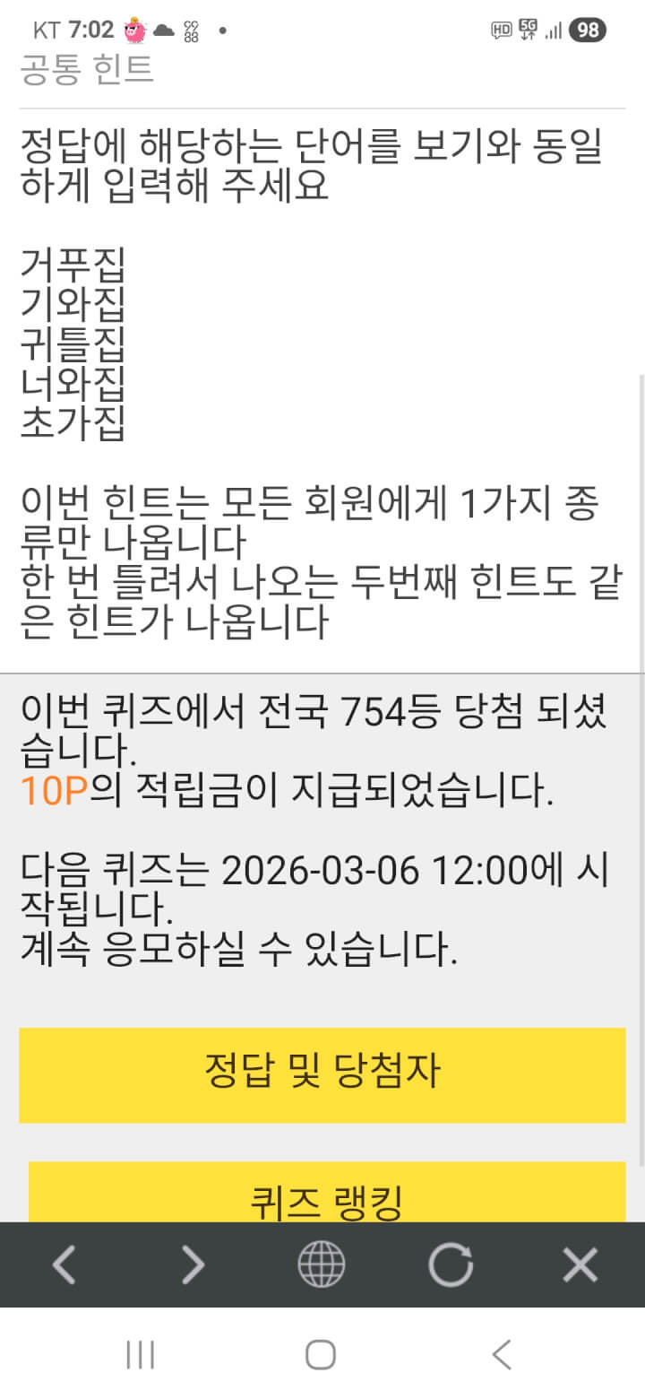 7시퀴즈 10원 받아 동참합니다 울푸시님들 댓글 함께해 주셔서 감사합니다 즐거운 오후시간 보내시고 5시퀴즈 대박하세요