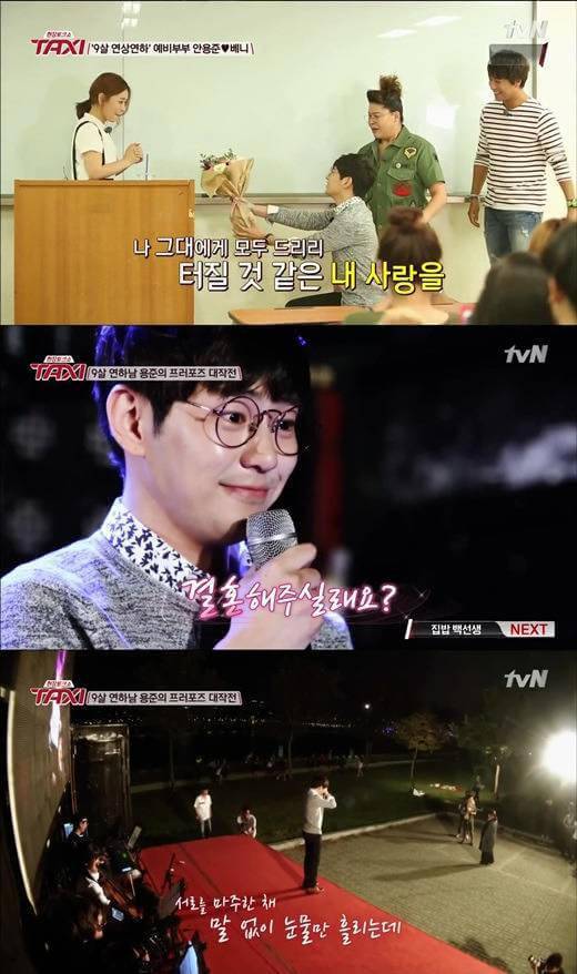 이런 철벽 방어 탓에 안용준은 강의실, 단골 술집, 플래시몹 현장까지 무려 세 번이나 프러포즈를 거절당했습니다. 결국 2015년 예능 현장토크쇼 택시 촬영 중 과감한 공개 프러포즈를 감행한 끝에 승낙을 얻어 부부의 연을 맺게 됩니다.