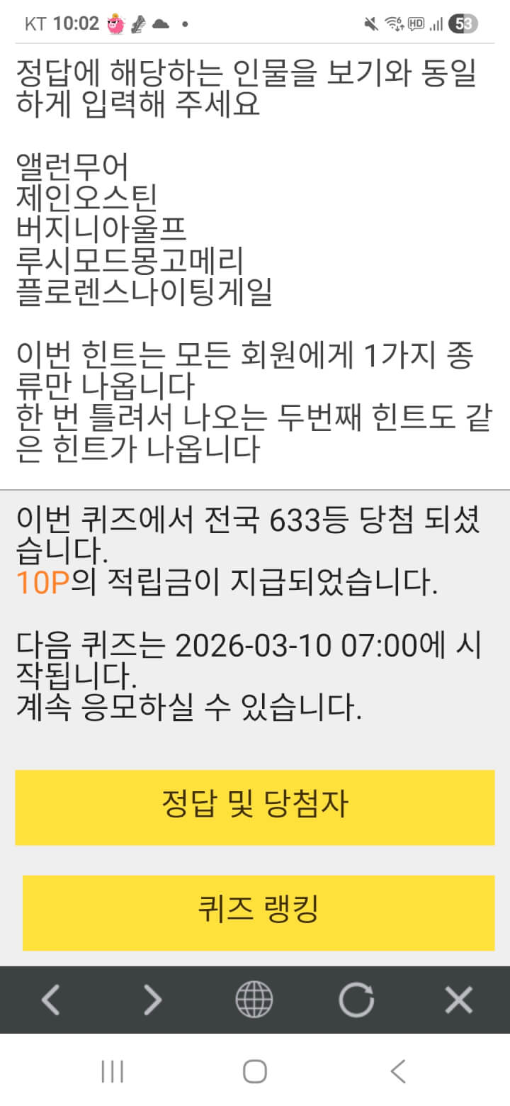 10시퀴즈 10원 받아 올려봅니다 울푸시님들 오늘하루도 수고많으셨어요 댓글 함께해 주셔서 감사합니다 즐거운 저녁시간 보내시고 편안한 밤 되세요