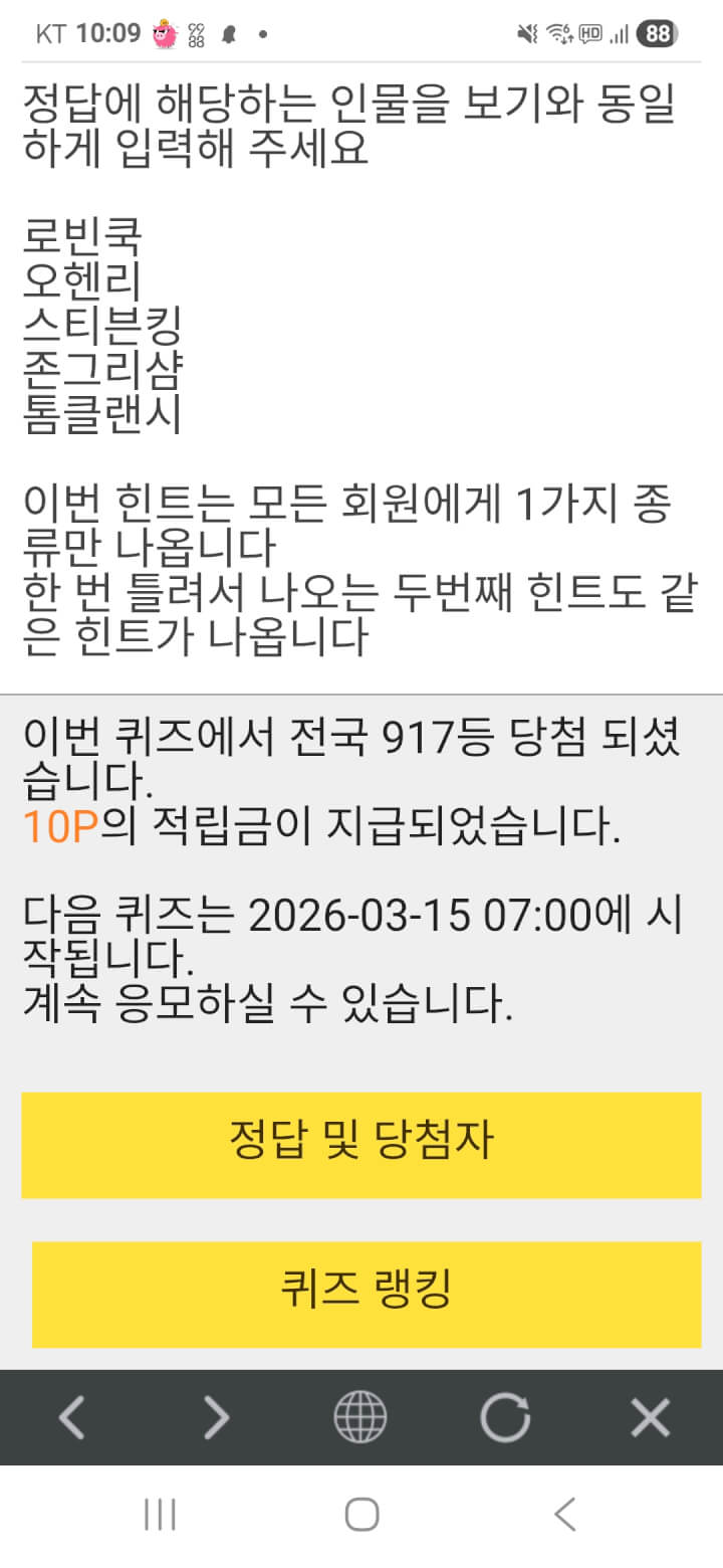 10시퀴즈 10원 받아 인사드립니다 오늘은 이제야 동참합니다 댓글 함께해 주셔서 고맙습니다 오늘하루도 수고많으셨어요 푸시님들 편히쉬세요