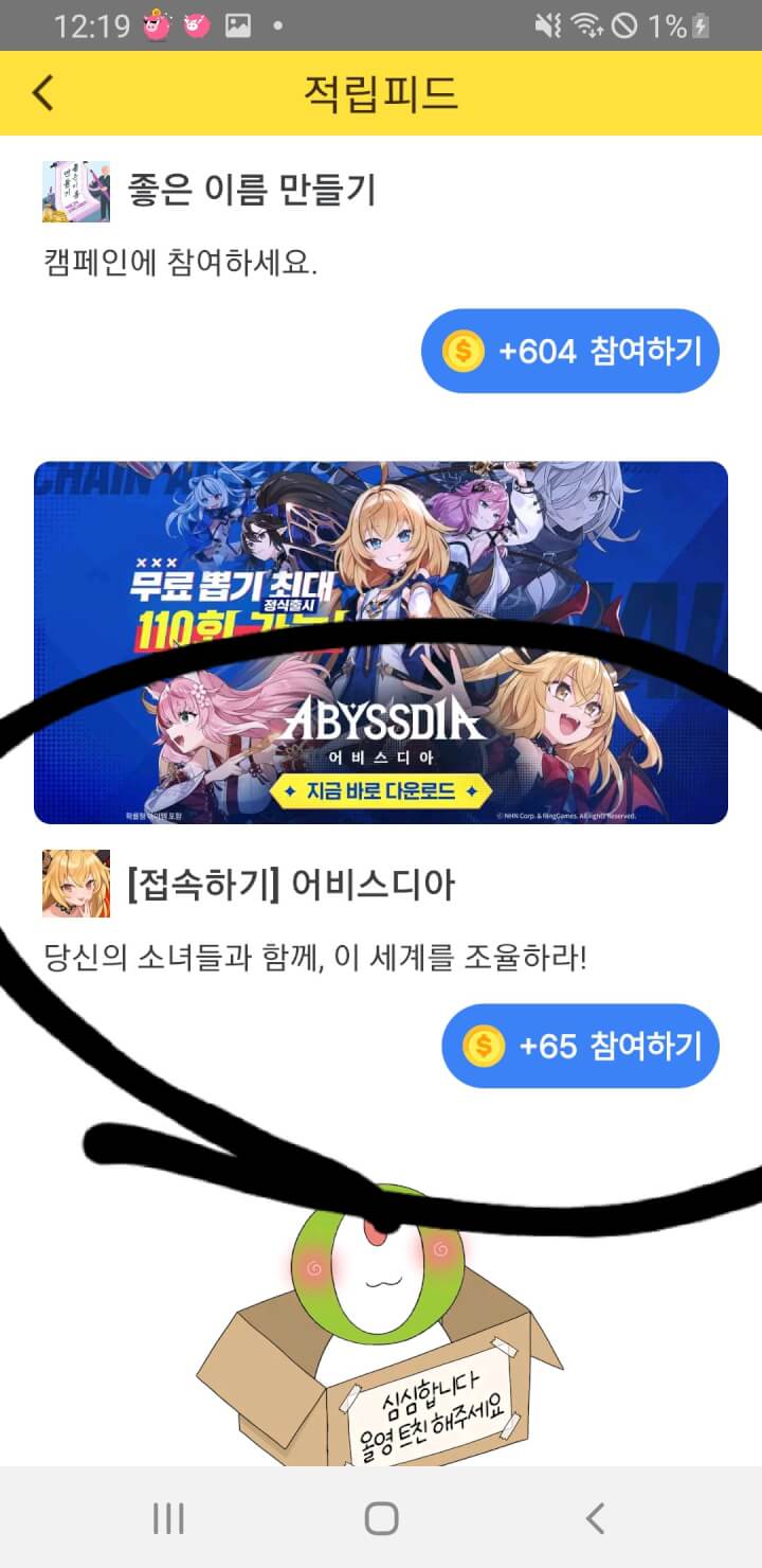 적립피드에 어비스디아 65점 적립 나왔어요.