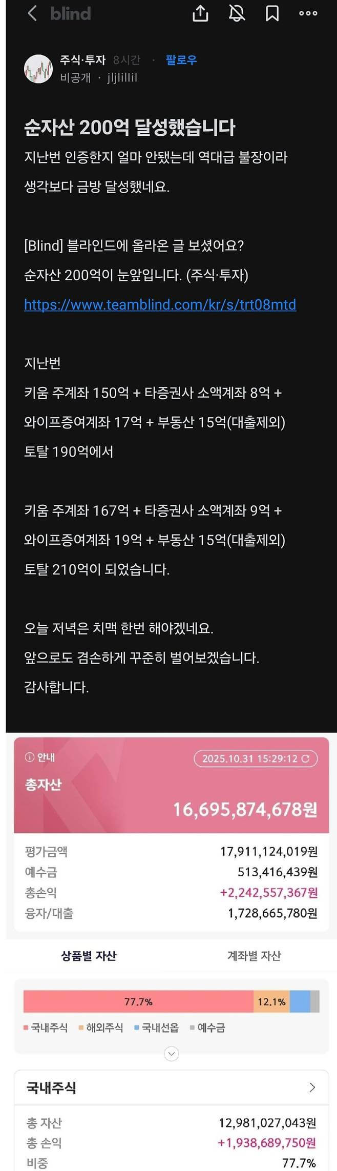 최근 역대급 불장으로 순자산 200억을 달성한 사람