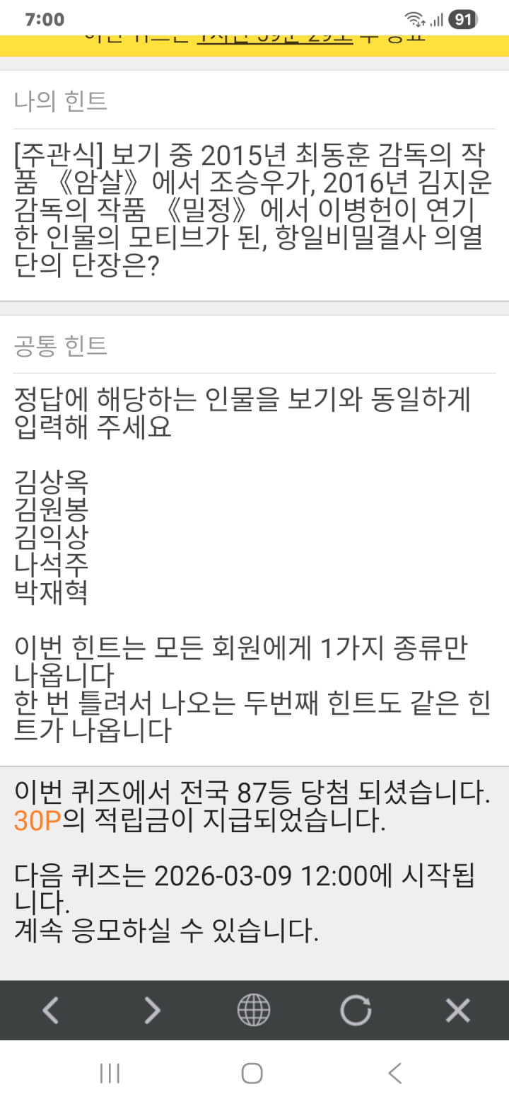 아침 퀴즈 이벤트 30원 획득 적립을 하였습니다. 감사합니다.