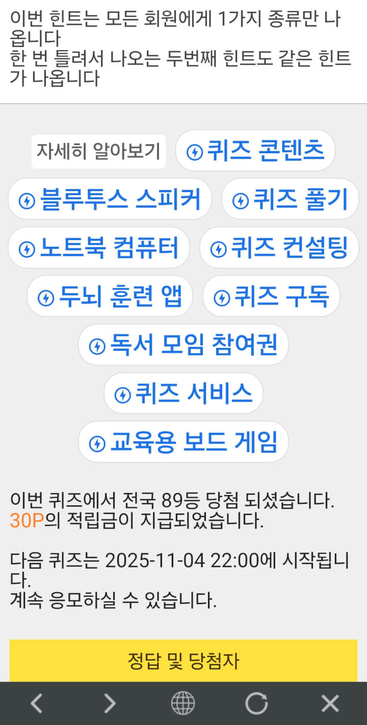 5시 퀴즈 오랜만에 30점 받았어요 10시 퀴즈 화이팅 하세요 ~~