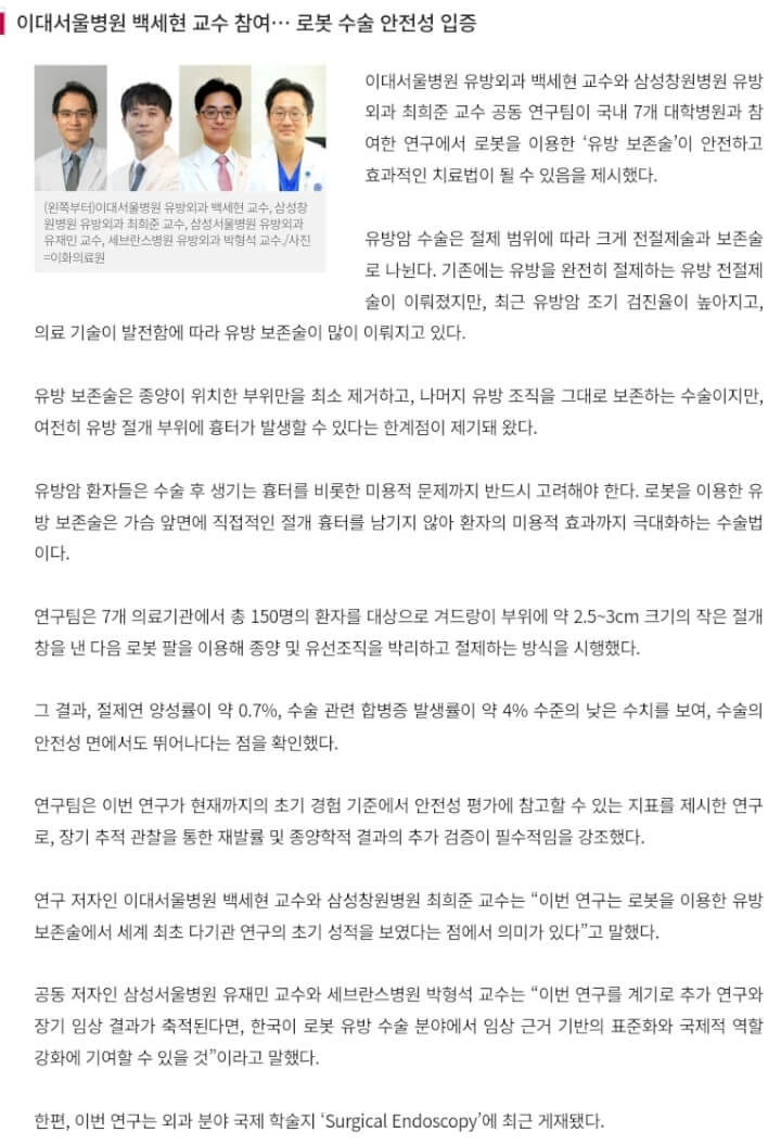 - 로봇 이용한 ‘유방 보존술’ 안전성·효과 입증