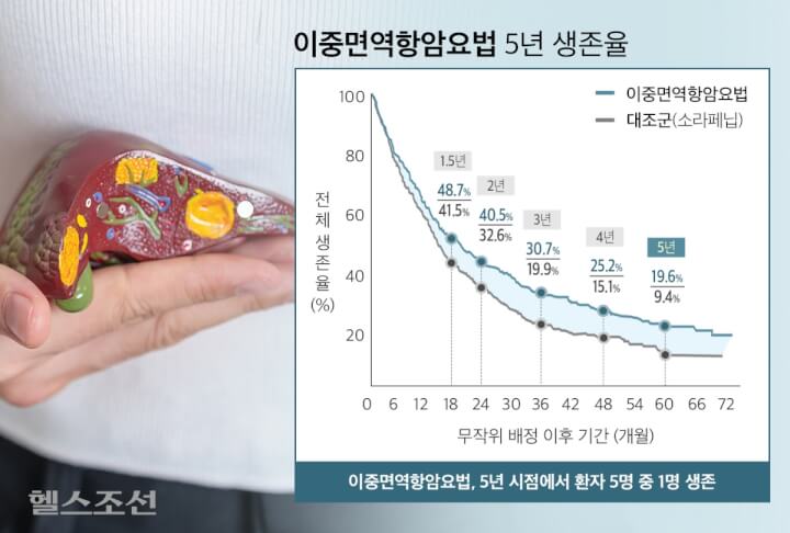 간암 환자를 대상으로 한 임상 연구 결과, 이중면역항암요법은 간 기능 저하 없이 치료 지속이 가능했으며 5년 전체 생존율도 기존 간암 치료법 대비 높았다.