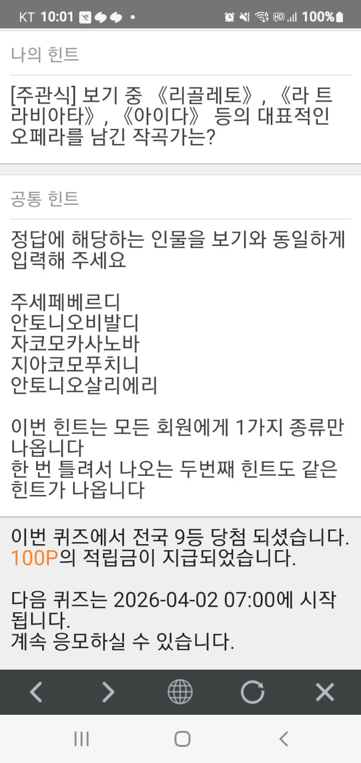 10시 퀴즈 9등 100원 받았어요 감사드려요 너무 오랜만이라 기분 좋아요 마무리 잘 하시고 편안한 밤 되세요 사랑합니다 ~~~~💓💓💓💓💓