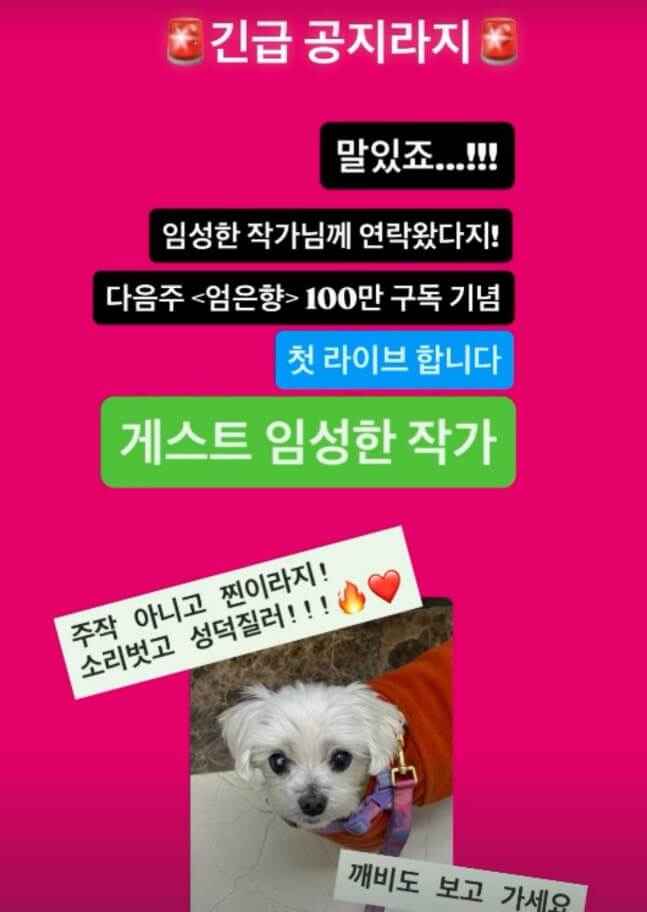 7일 크리에이터 엄은향은 자신의 개인 계정에 긴급 공지를 올리며 임성한 작가의 방송 출연 소식을 전했다.