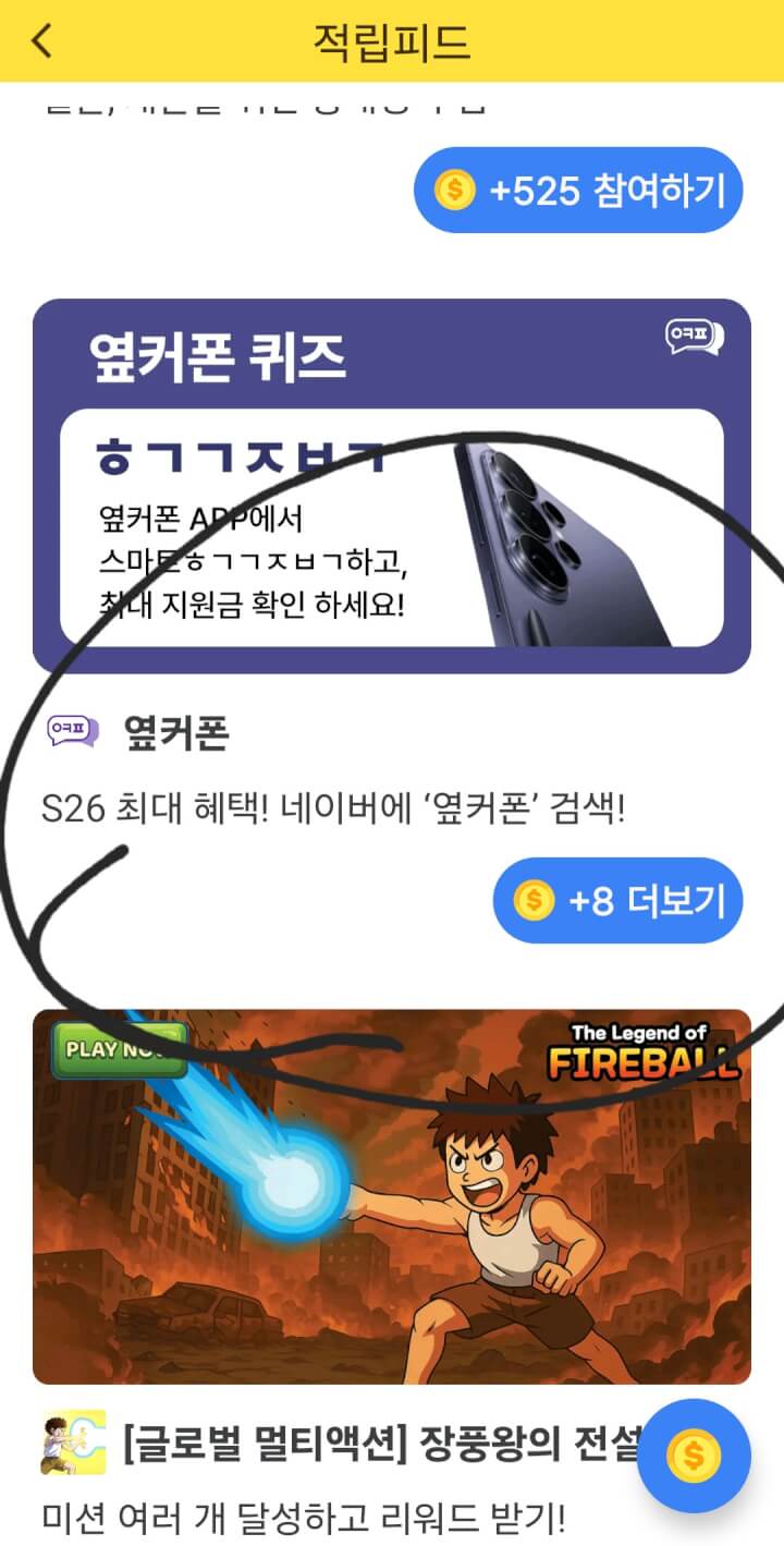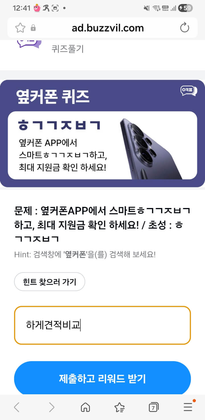 적립피드에 옆거폰 8점 초성퀴즈 적립 있어요. 정답:하게견적비교~~