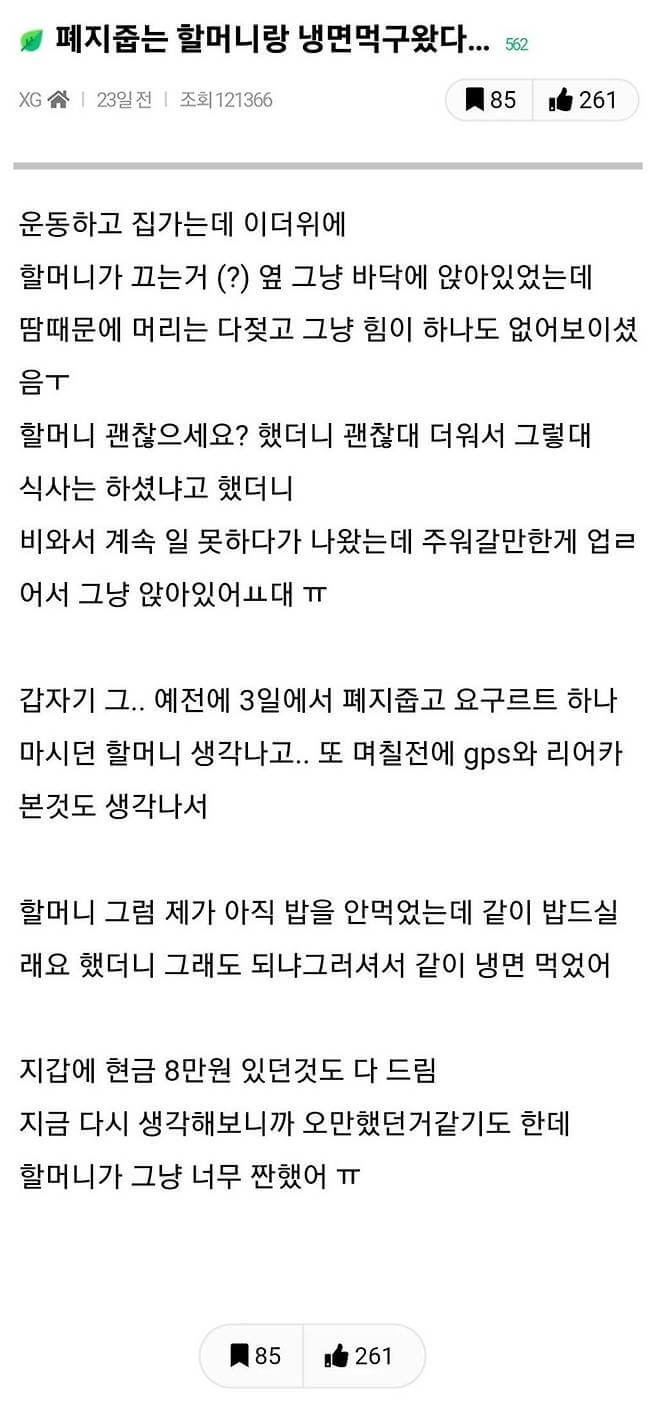 - 폐지 줍는 할머니와 냉면 먹고 8만 원까지 준 사람