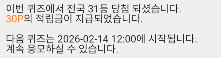 7시, 12시 퀴즈에서 30p 받았습니다 😊 함께해 주셔서 감사합니다 ❤️🩷🧡🍀