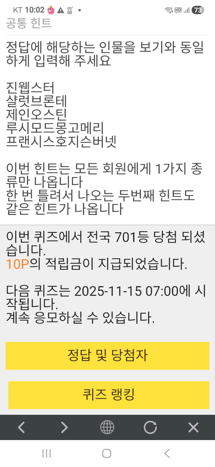 10시퀴즈 10원 받아 올려봅니다 울푸시님들 오늘하루도 수고많으셨어요 남은 저녁시간 행복하시고 편안한 밤 되세요
