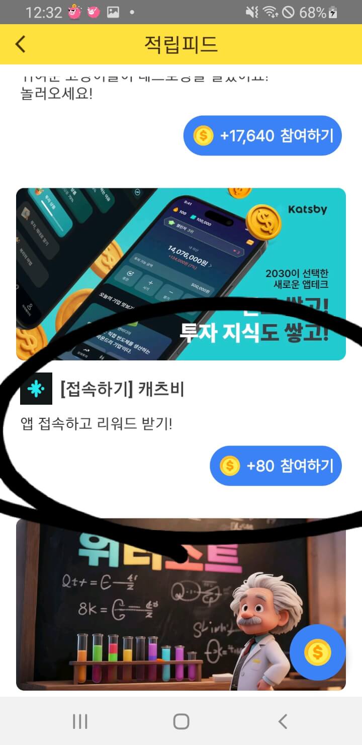 적립피드에 캐츠비 80점 적립 나왔어요.