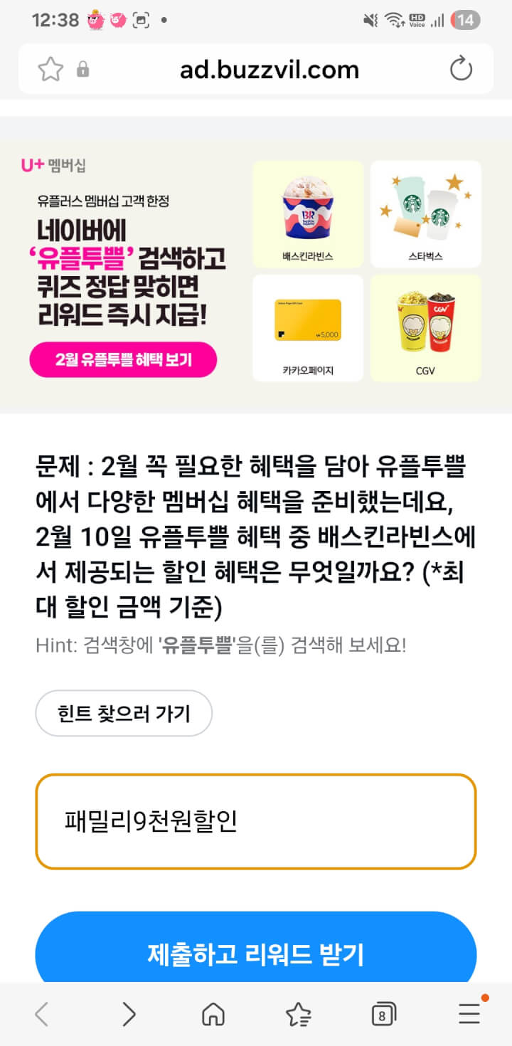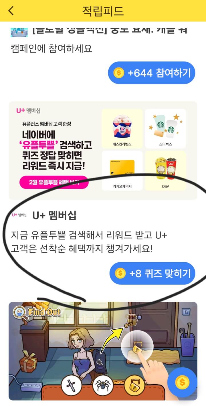 적립피드에 U+맴버십 8점 적립 있어요. 답:패밀리 9천원할인~~