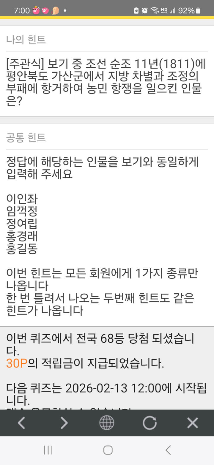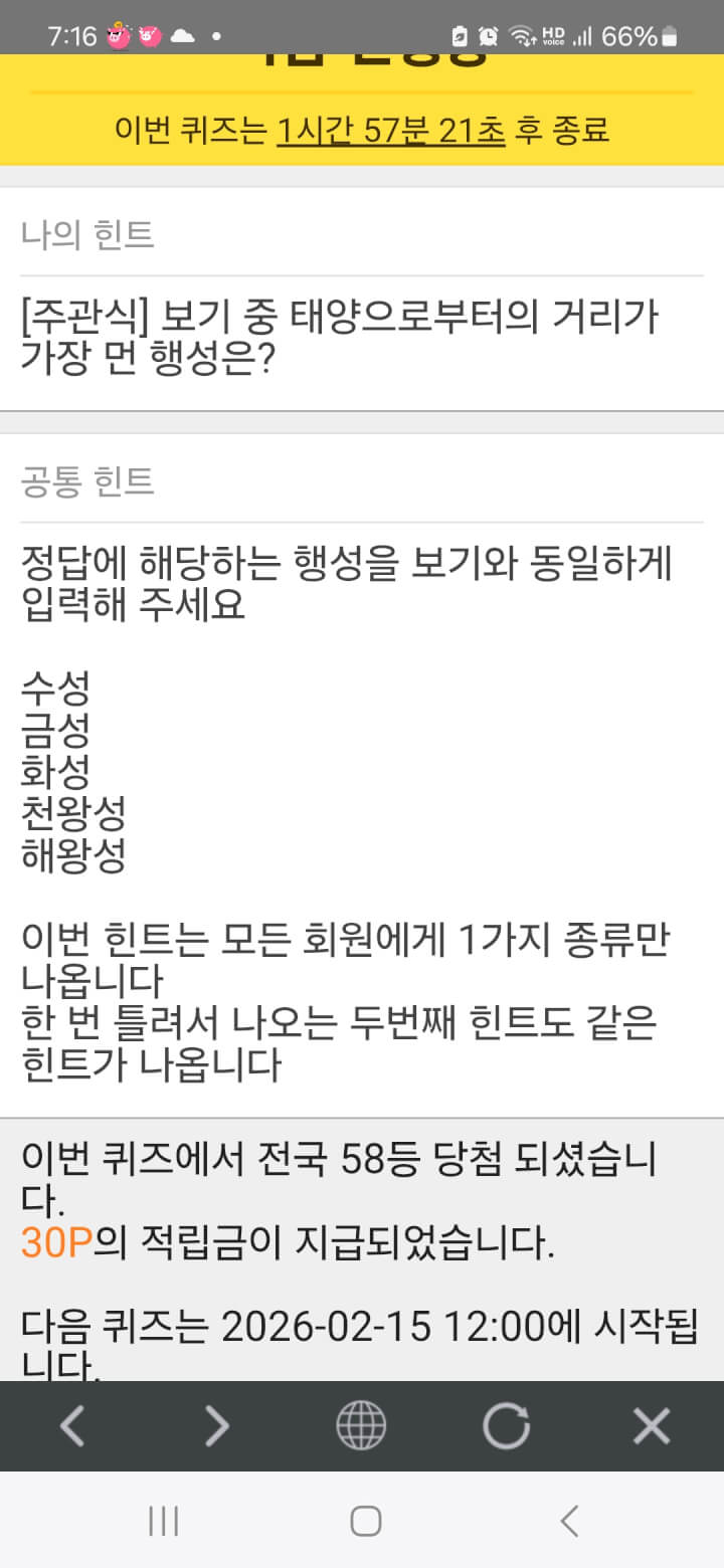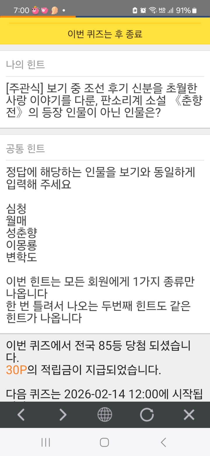 삼일연속 아침 퀴즈 30원 받았네요 연휴에 이런 쾌감도 있네요