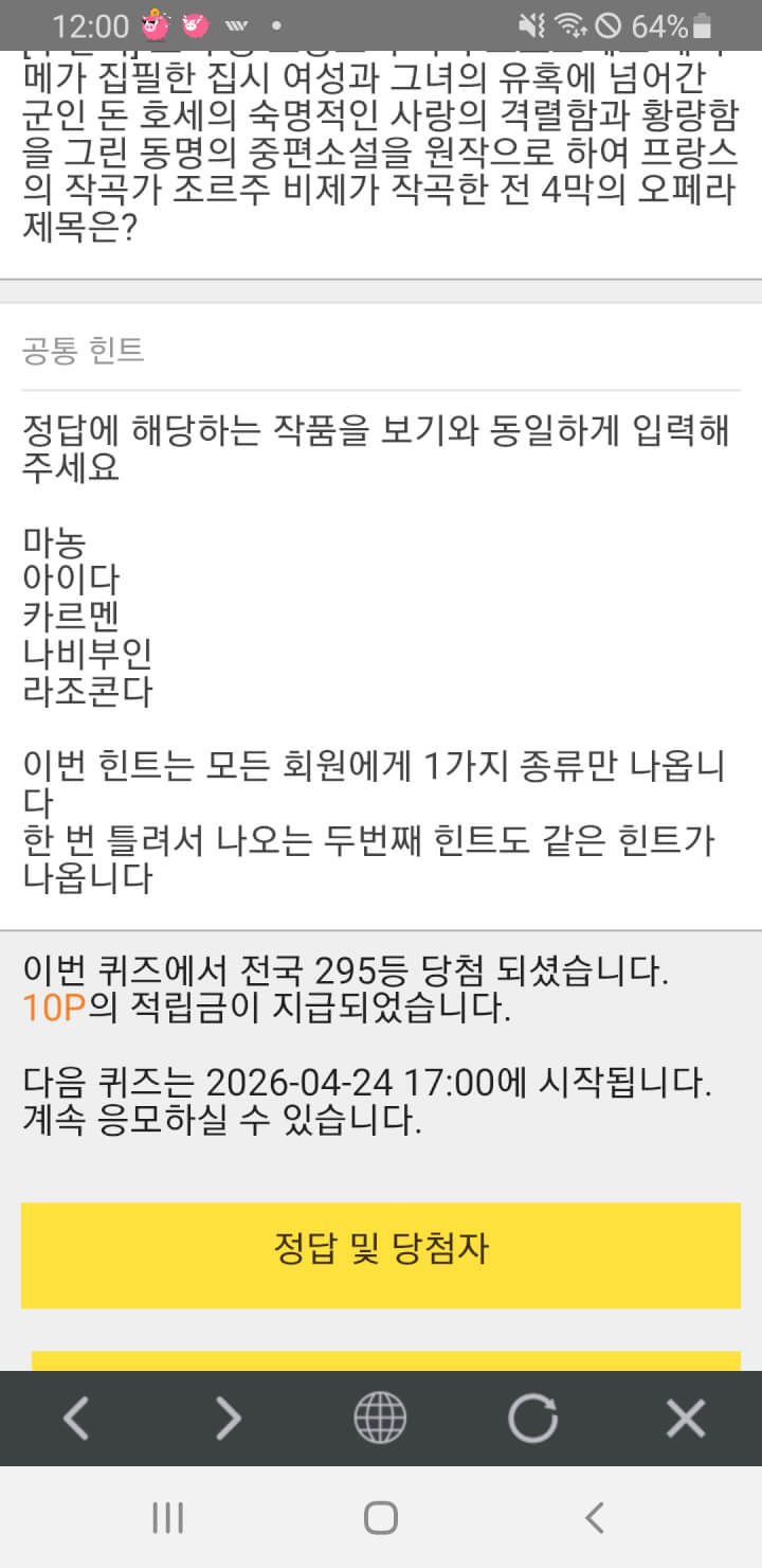 12시 퀴즈10점 받았어요. 즐거운 저녁시간 되세요.
