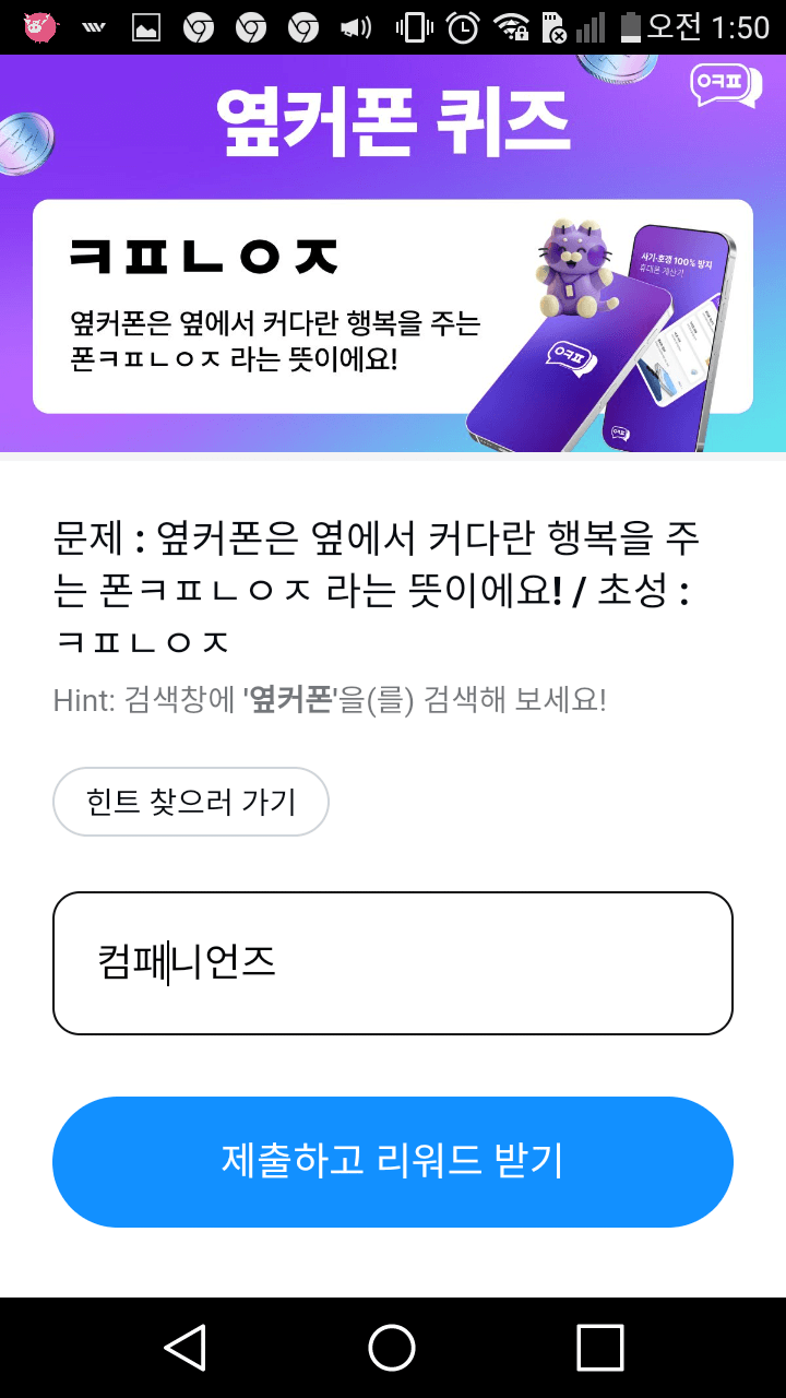 적립피드에 옆거폰 8점 초성퀴즈 적립 있어요 답:컴패니언즈♥♥