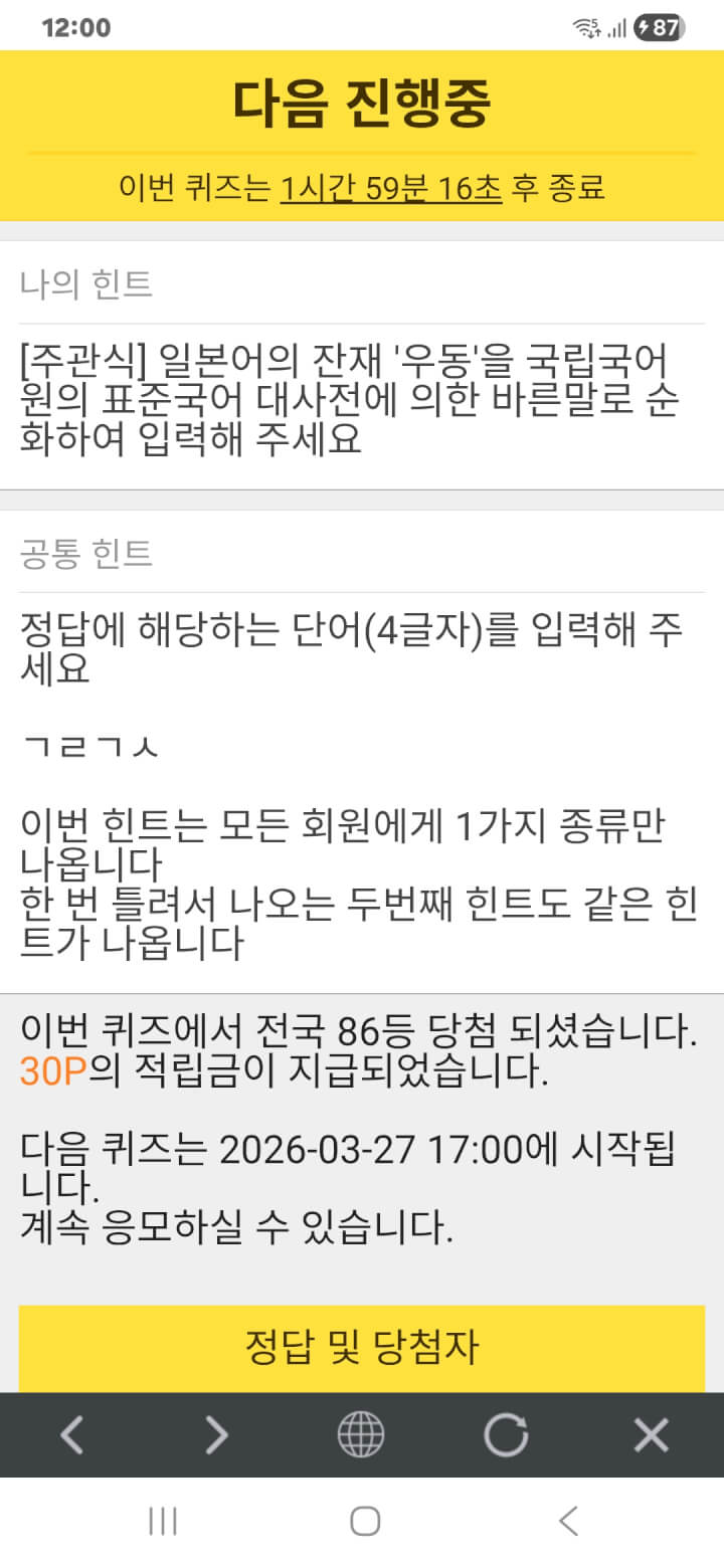 퀴즈 이벤트 30원 획득 적립을 하였습니다. 감사합니다.