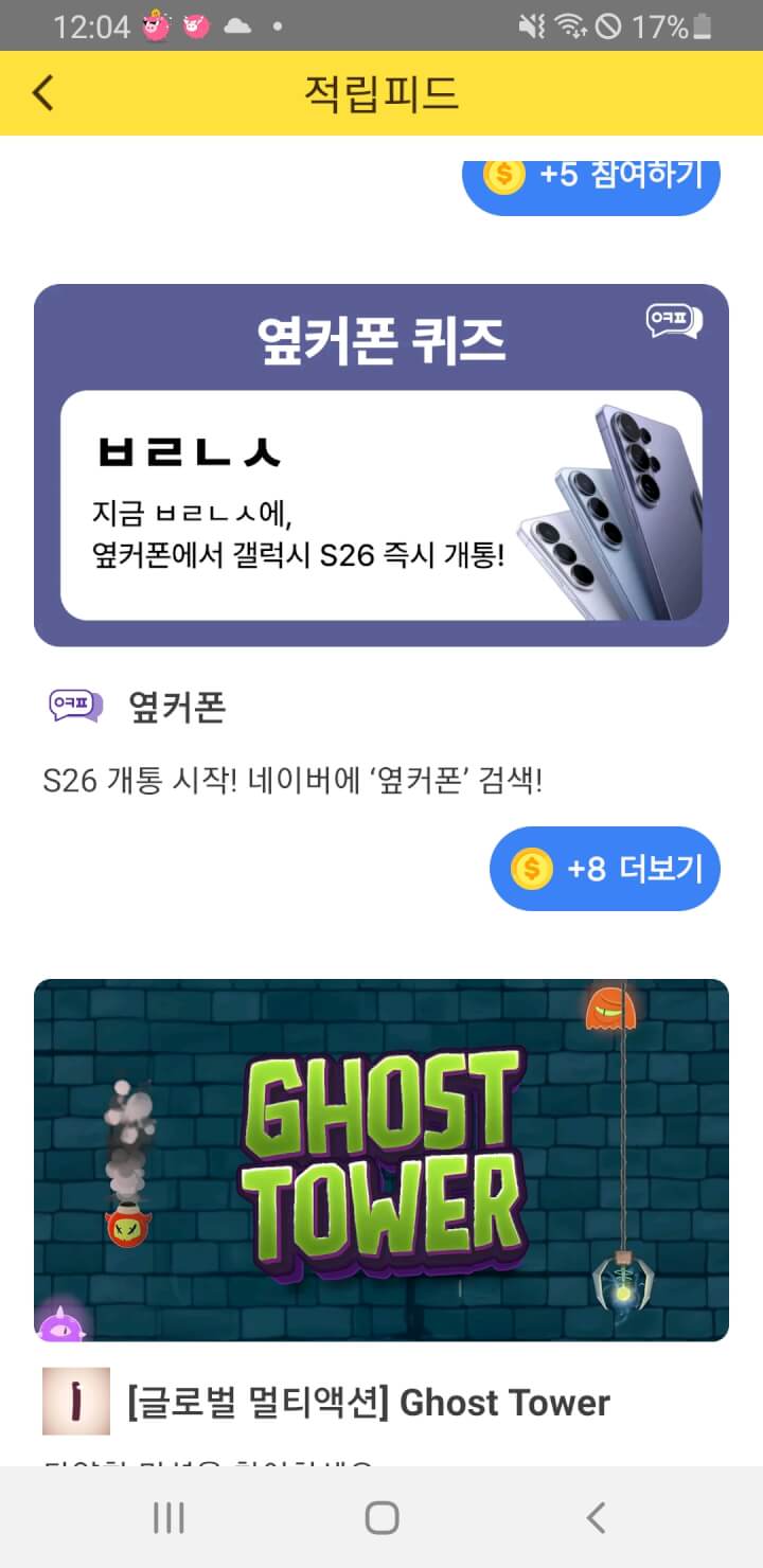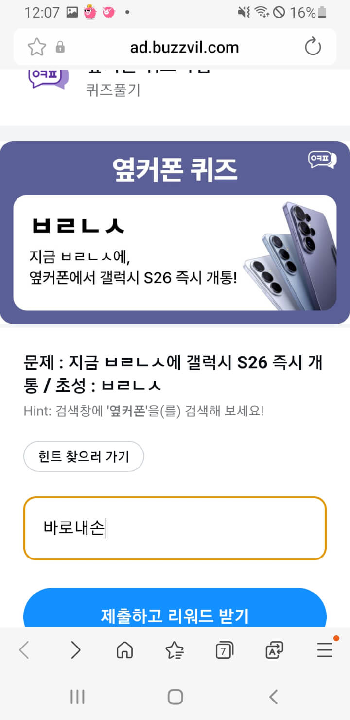 적립피드에 옆거폰 초성퀴즈 적립 있어요. 답;바로내손~~