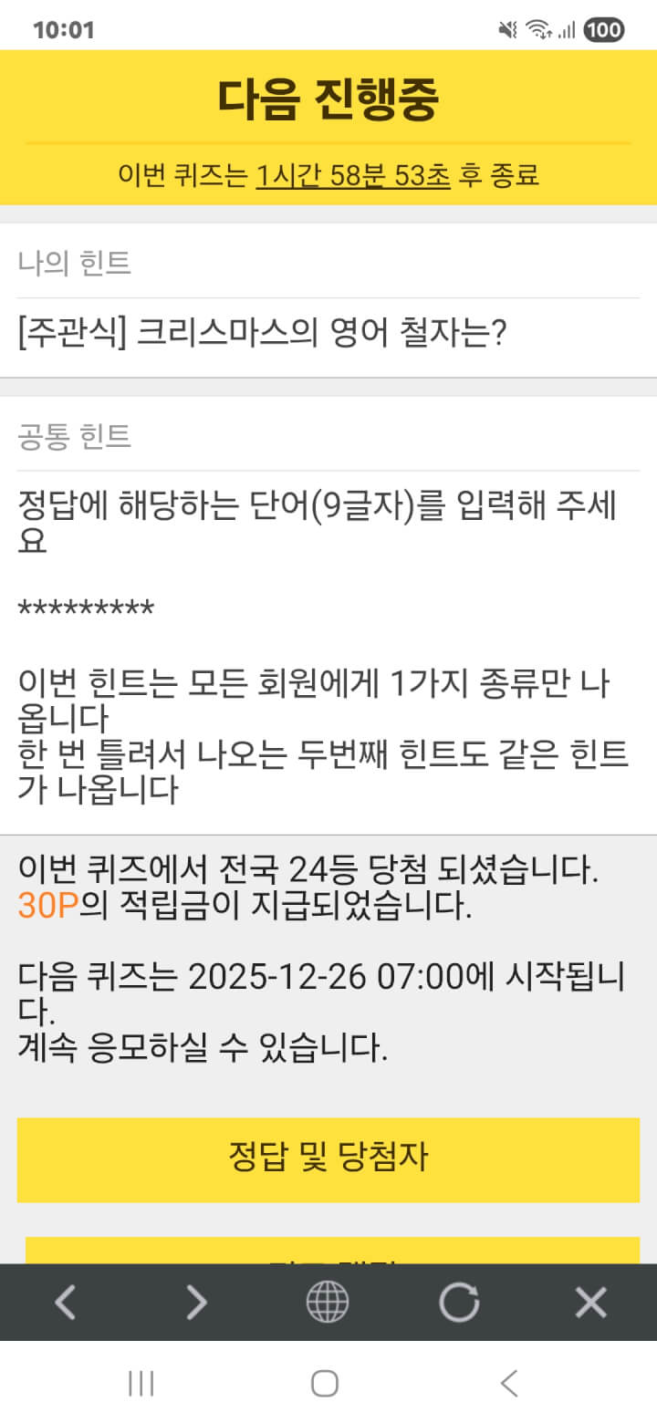 퀴즈 이벤트 30원 획득 적립을 하였습니다. 감사합니다.